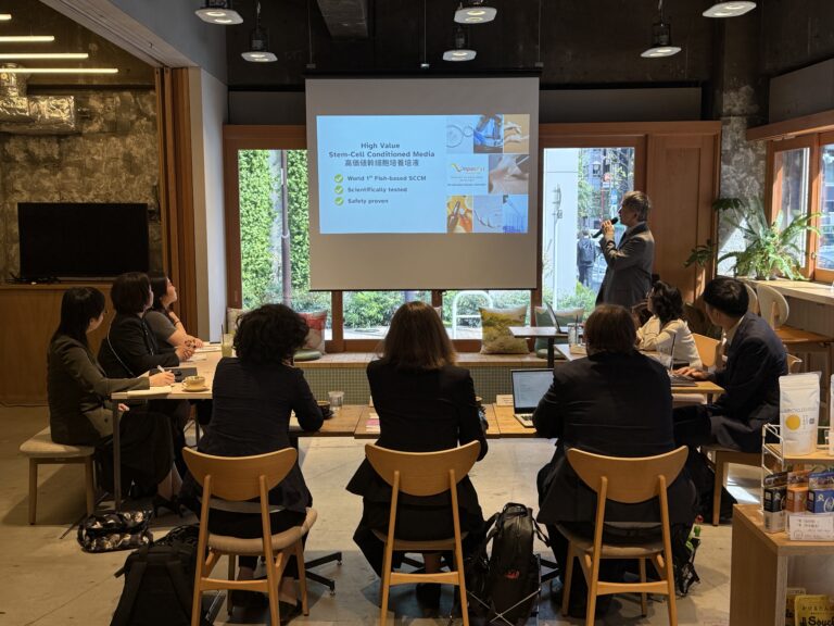 細胞培養による「魚の脂肪(オメガ3脂肪酸)」の生産という革新的な取り組みをプレゼンテーション。食品用途にとどまらず、サプリメントやコスメ市場向けの機能性原料としての供給を目指しています。